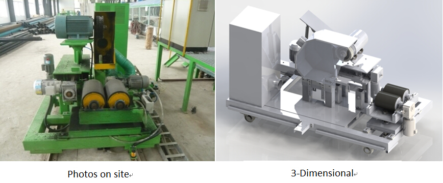 Function description: The end cleaning device includes 2 sets of end-supporting pipe, 2 sets of end-cutting trolleys and other pneumatic, hydraulic, electrical control system, smooth surface solid tires supporter. The motor drives the end-supporting cars to fine-tune that can assures the rotating of the pipe steadily, High-speed rotating steel brush driven by the end-cutting cars brushes off the pipe-end anti-corrosion coating layer, High efficiency dust removal system sucks away the plastic dust that is cut down by the steel brush so that can assures the working environment clean.