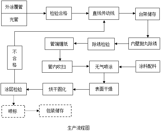1、3PE生產(chǎn)線進管 2、進管臺架 3、直線輸送輥道 4、除塵器 5、內(nèi)噴涂進管臺架 6、鋼管內(nèi)壁除銹設備 7、過渡臺架 8、鋼管內(nèi)壁噴涂設備 9、內(nèi)噴涂出管臺架 10、直線輸送輥道 11、涂層固化室 12、成品管出管臺架