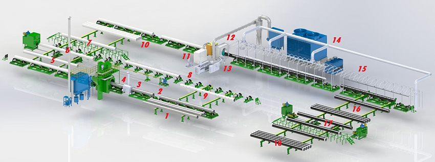 注:1、進(jìn)管臺(tái)架 2、除銹螺旋輥道 3、燃?xì)忸A(yù)熱爐 4、外壁拋丸除銹機(jī) 5、除銹出管臺(tái)架 6、鋼管內(nèi)壁吹掃裝置 7、檢測(cè)平臺(tái)8、廢管返回直線(xiàn)輥道 9、廢管返回臺(tái)架 10、涂覆螺旋輥道 11、中頻加熱裝置 12、FBE噴涂裝置 13、AD/PE纏繞裝置14、冷卻塔裝置15、鋼管涂層冷卻室 16、涂覆出管臺(tái)架 17、管端處理裝置 18、成品管出管臺(tái)架