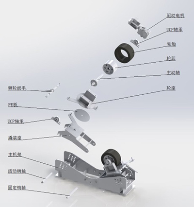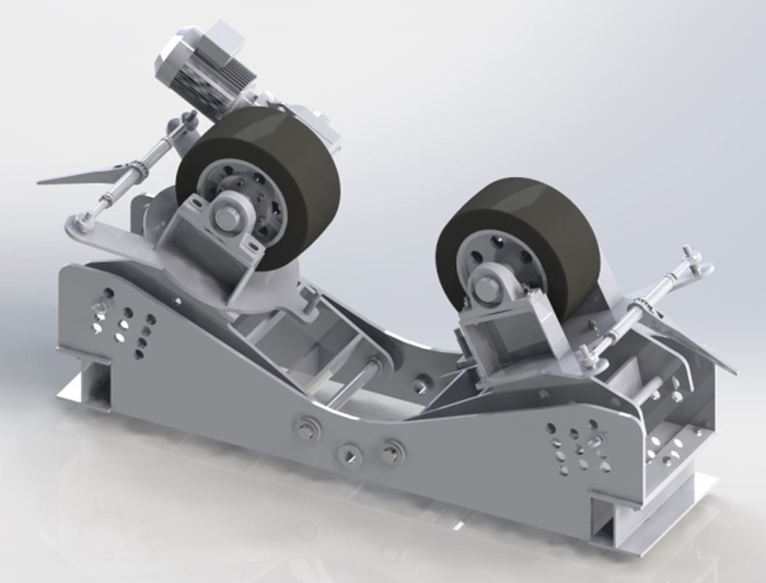 雙輪胎式輸送輥道常用結(jié)構(gòu)為滑板式和孔距調(diào)整式,孔距調(diào)整式螺旋輥道具有管底高變化量小,按鋼管管徑級(jí)別調(diào)整的功能,維修維護(hù)方便,變形量小,可用于現(xiàn)場快速撬裝特點(diǎn)。傳動(dòng)輪角度采用棘輪調(diào)節(jié),兩輪胎包角大于60度,輪組間用拉桿相連,拉桿可調(diào)節(jié),端部采用桿端關(guān)節(jié)軸承連接,保證輪胎角度調(diào)整的簡便性及統(tǒng)一性,確保傳動(dòng)線的運(yùn)行平穩(wěn);輪胎底座下兩配合面之間配1~2mm聚四氟夾層,調(diào)整輪間距時(shí)簡捷省力;調(diào)節(jié)精度在調(diào)節(jié)輪組處均配裝刻度尺,以便于觀察。傳動(dòng)線在調(diào)整完畢后,用鎖緊裝置將傳動(dòng)線鎖緊。并保證調(diào)節(jié)裝置能夠取下移出。