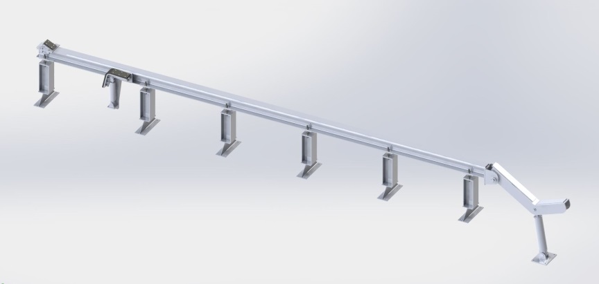 功能描述:臺(tái)架在生產(chǎn)線中用于各個(gè)工序之間,存儲(chǔ)和運(yùn)輸鋼管的作用。臺(tái)架上鋪設(shè)聚氨酯板或PE板(根據(jù)客戶要求,常規(guī)厚度15mm),保護(hù)鋼管除銹后外壁錨紋深度及涂覆后的PE層。由2條型鋼組成,可滿足鋼管承重要求,臺(tái)架設(shè)置一定的斜度,臺(tái)架立柱間隔2m左右。立柱同地基采用化學(xué)錨栓固定,擋管器固定于臺(tái)架上,撥管及上下管裝置放置于臺(tái)架兩側(cè)。