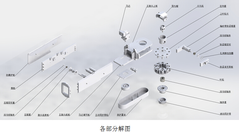 功能描述:拋頭包含拋頭支架、液壓馬達(博世—力士樂)、葉輪組件、導向輪。待鋼管兩端被前后倉罩住后,液壓馬達啟動并帶動拋頭高速旋轉(zhuǎn)(根據(jù)管徑進行設置拋射轉(zhuǎn)速),漏砂閥打開延時聽到鋼砂與金屬撞擊的聲音后液壓驅(qū)動車向前推進拋頭并進入到鋼管內(nèi),輸砂伸臂上的旋轉(zhuǎn)支撐保證拋頭保持在鋼管軸線中心位置前進。根據(jù)拋頭打出的拋射扇面調(diào)整鋼砂的供給量、拋射速度、拋頭行進速度及鋼管的旋轉(zhuǎn)速度。